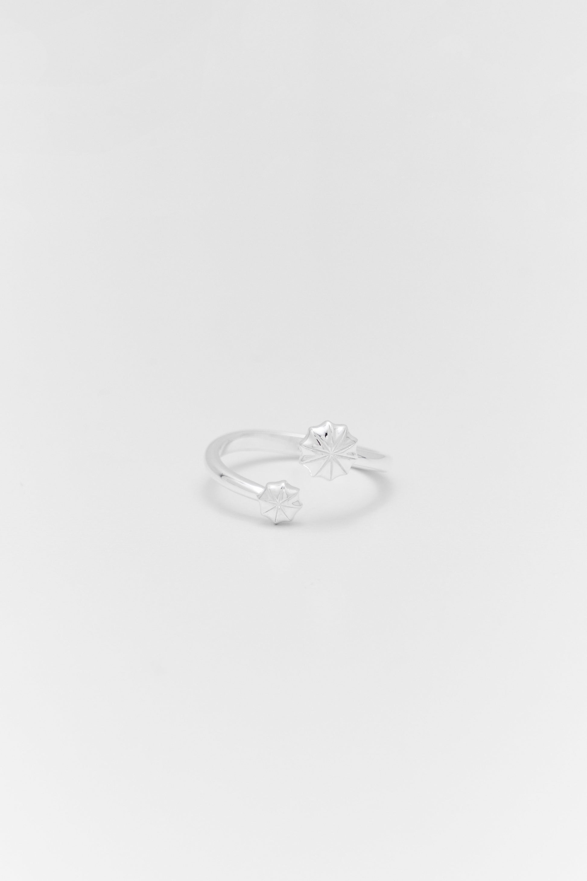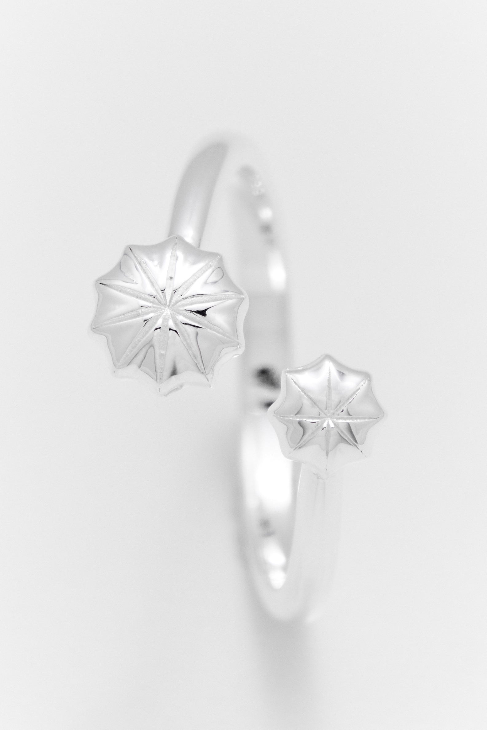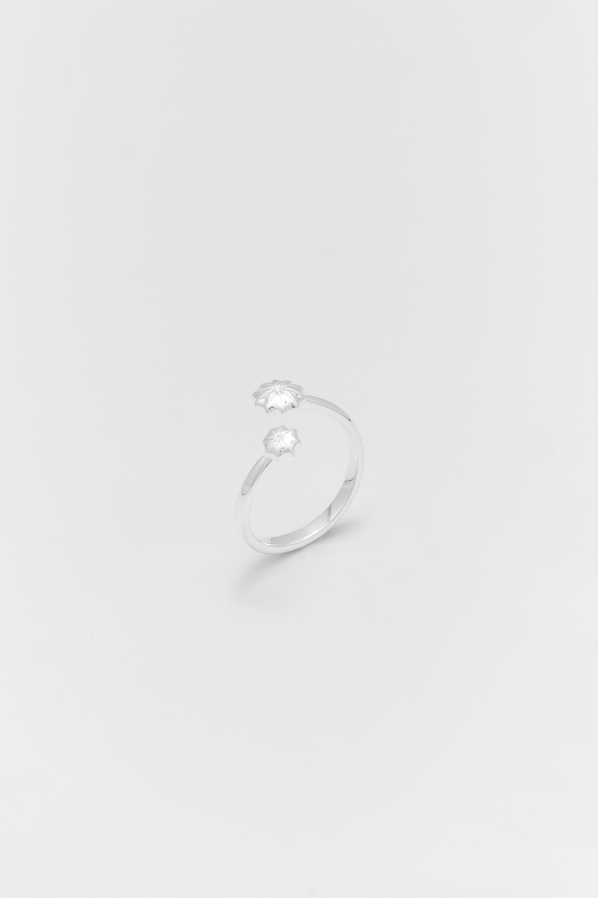 以純銀打造,風格簡約而優雅。作品採用開口式戒身設計,線條流暢輕盈,能輕鬆調整配戴尺寸。戒環兩端各飾有一枚繖狀花紋,一大一小的對比設計,如同兩顆遙相呼應的星辰,在指間綻放出獨特的靜謐光芒。