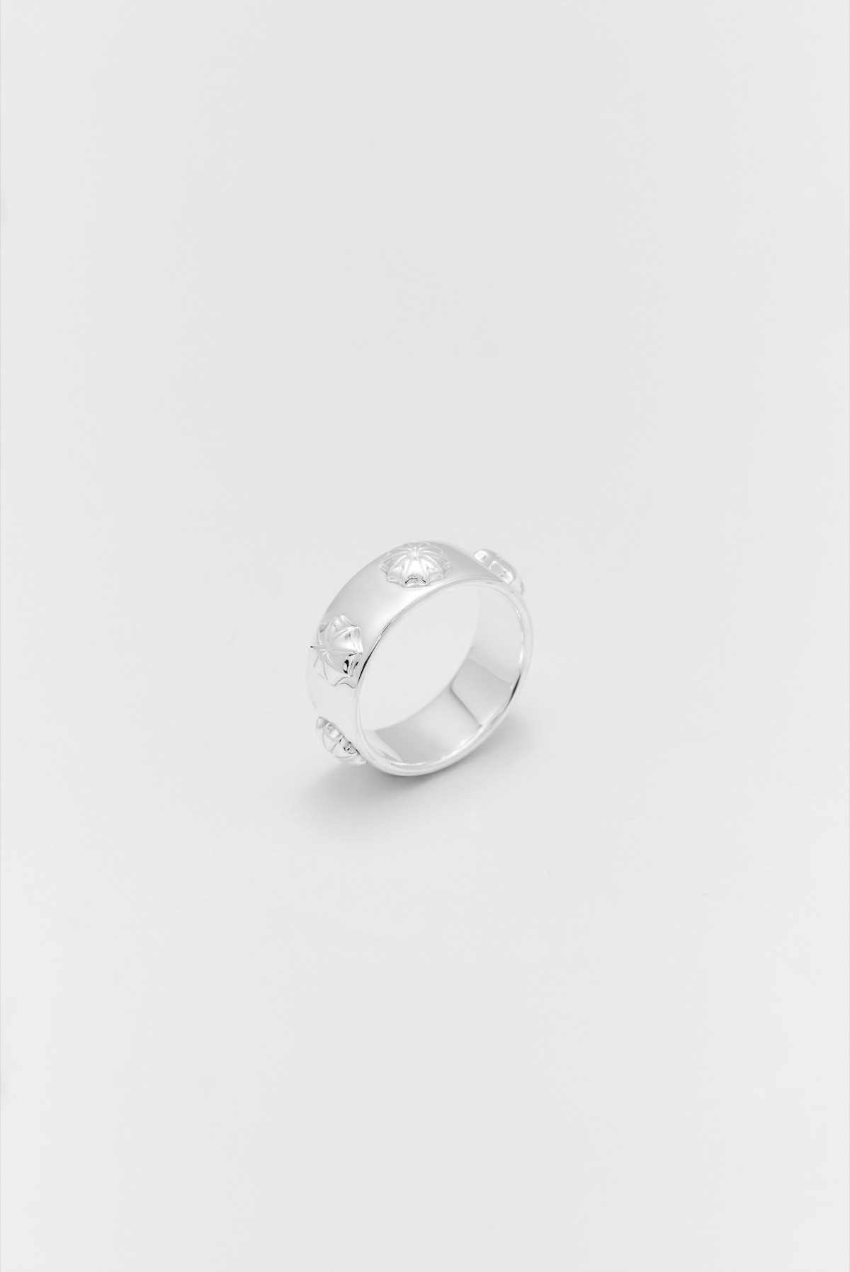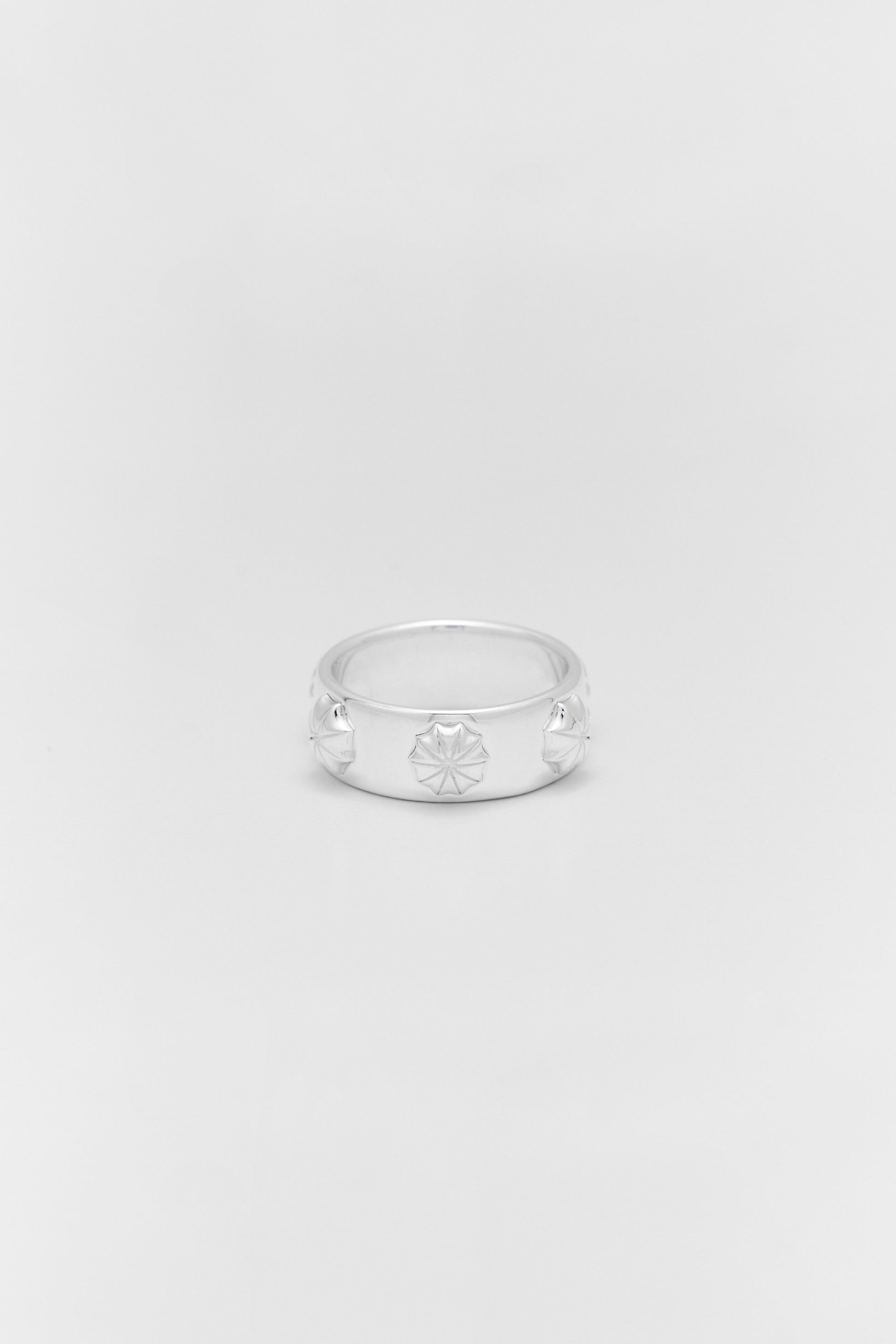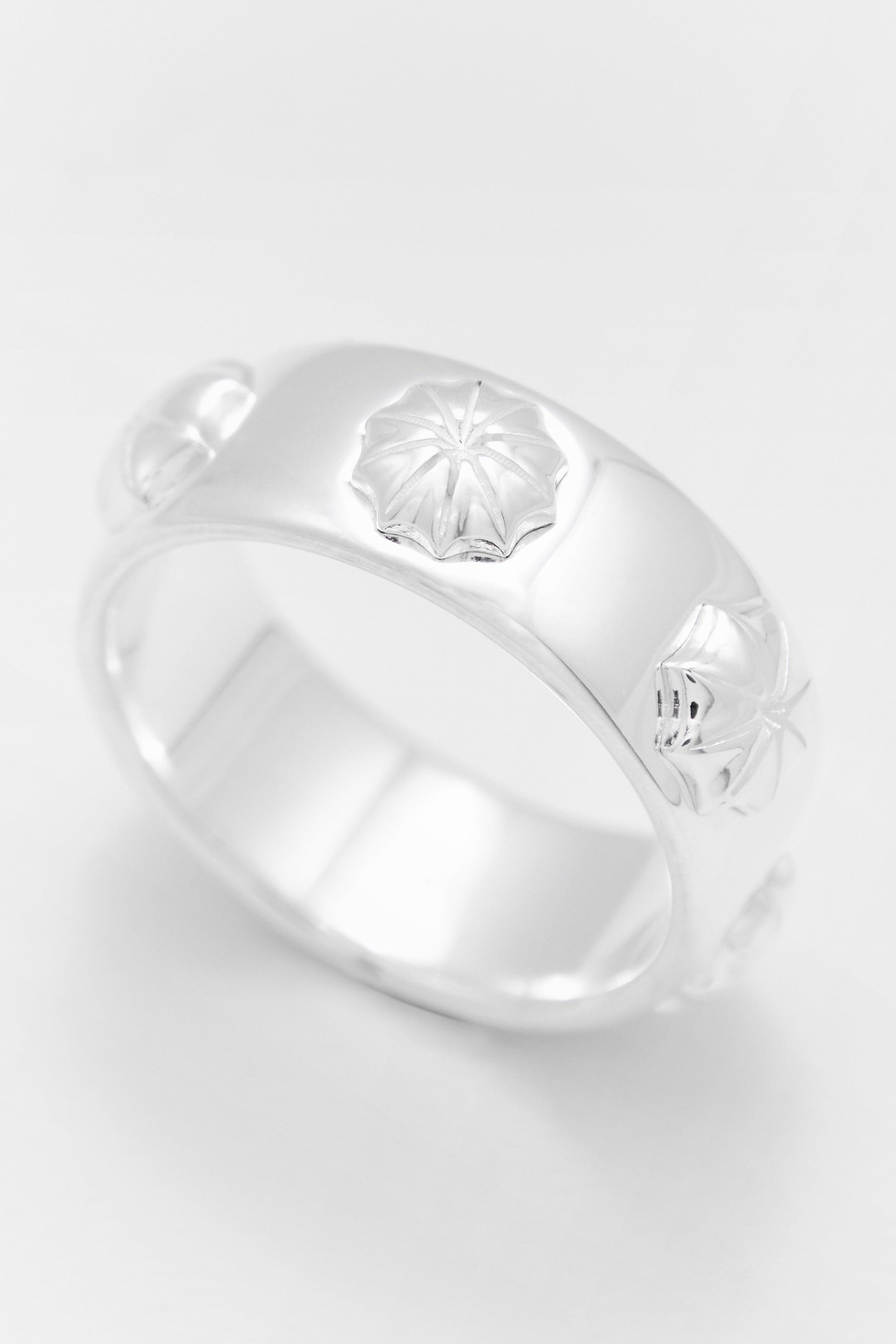 設計的巧思在於戒環上對稱排列的立體繖狀花紋。這些浮雕花紋精緻細膩,宛如盛開的花朵,在戒指的靜謐中注入了生動的自然意象。這款戒指不僅是時尚單品,更是一件低調的藝術品,適合在各種場合佩戴,彰顯您不凡的品味與自信。